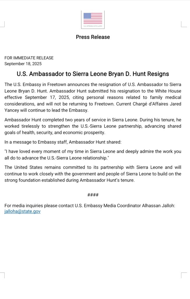 The United States Embassy in Freetown has officially confirmed the resignation of U.S. Ambassador to Sierra Leone, Bryan D. Hunt, effective September 17, 2025. According to the Embassy, Ambassador Hunt stepped down for personal reasons linked to family medical considerations and will not be returning to Sierra Leone.